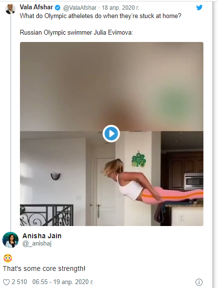 Ролик с домашней тренировкой, который опубликовала на днях пловчиха Юлия Ефимова, породил бурное обсуждение в соцсетях. На видео можно наблюдать, как спортсменка, держась за кухонную столешницу только ногами, имитирует в воздухе плавательные движения. Причём проделывает это легко, вопреки всем законам физики.