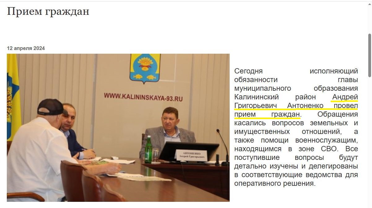 Интересно, приём граждан теперь уже бывший чиновник Антоненко (на фото справа) проводил в той же манере, что и встречу со спасателями? Скриншот: интернет-сайт kalininskaya-93.ru