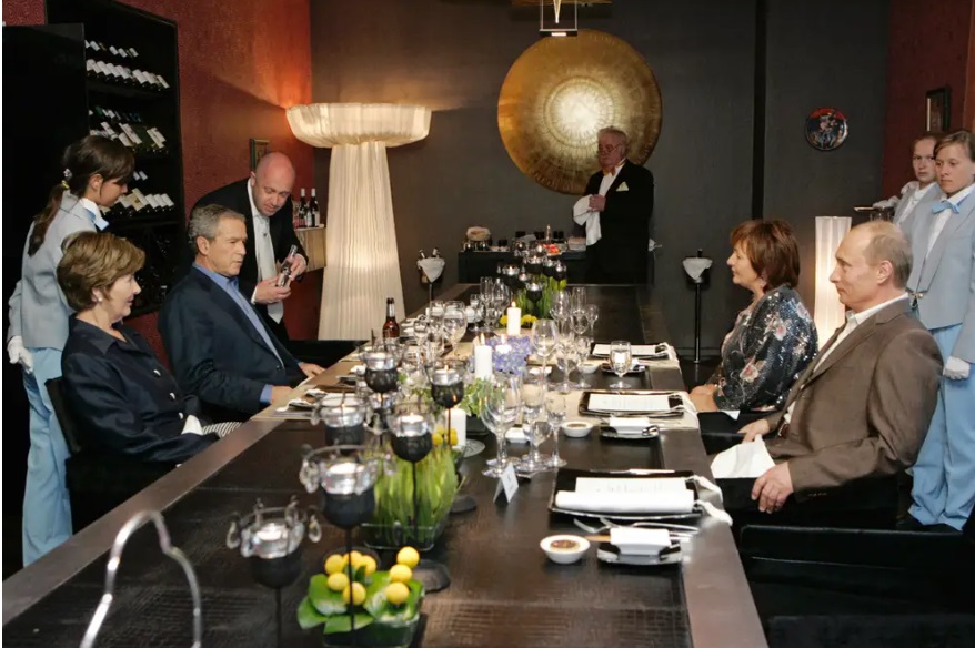Фотография, разлетевшаяся недавно по соцсетям, была сделана на саммите G8, проходившем в Санкт-Петербурге в 2006 году. На снимке оказались президент России Владимир Путин и тогдашни американский лидер Джордж Буш-младший, которые ужинали в Большом Стрельнинском дворце. А Евгений Пригожин лично обслуживал их стол и тоже вошёл в кадр.