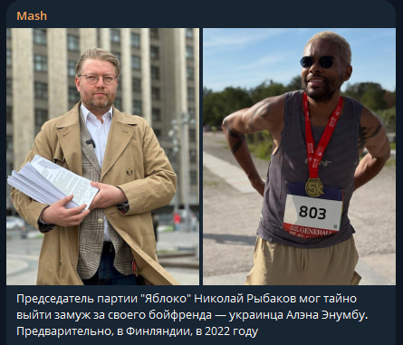 Партия "Яблоко" на этой неделе неожиданно напомнила о своём существовании: сначала позавчера задержали за фейки про армию России зампреда Максима Круглова, сегодня вскрылись дикие подробности о личной жизни председателя партии Николае Рыбакове. Телеграм-канал Mash утверждает, что депутат мог тайно выйти замуж за украинца Алэна Энумбу. Издание предполагает, что это произошло в Финляндии, где у последнего есть недвижимость.
