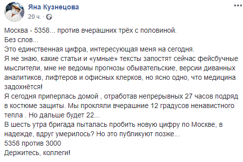 На своей странице в Facebook врач больницы в Коммунарке Яна Кузнецова высказалась о ситуации, сложившейся с распространением коронавируса в столице. Сдержать эмоции в этих обстоятельствах сложно.