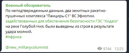 Из строя "Панцири" были выведены из-за попадания в них молнии. Пока неизвестно, лишилась ли Эфиопия защиты, так как других деталей случившегося не публикуется.