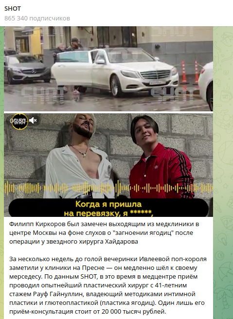 Отметим, что подлинность этого аудиосообщения не подтверждена. Супруга хирурга после появления этой аудиозаписи заявила SHOT, что это всё чушь. Однако и директор Киркорова отказалась комментировать, что именно певец делал в другой клинике после пластических операций у Хайдарова.