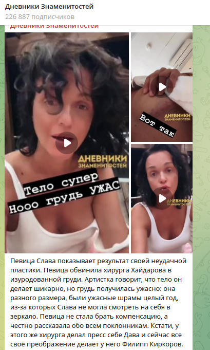 Та же Слава захотела откорректировать у хирурга грудь, легла под нож. Но результату немало изумилась, после жаловалась на рубцы и шрамы, которые остались у неё. Не стеснялась показать их на всю страну, публикуя красноречивые фото на своей странице в соцсетях. Утверждала, что год жила после этой операции в стрессе и вообще на себя в зеркало даже смотреть не могла.