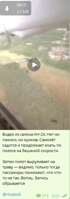"Самолёт садится и продолжает ехать по полосе на бешеной скорости, - говорится в сообщении. - Затем пилот выруливает на траву - видимо, только тогда пассажиры понимают, что что-то не так. Вопль. Запись обрывается".