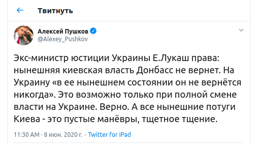 Российский сенатор Алексей Пушков у себя в Twitter поддержал мнение Лукаш, подтвердив, что "нынешняя киевская власть Донбасс не вернёт".