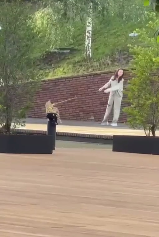 В центре Москвы девушка выгуливала экзотического питомца: хищный сервал рвался с поводка, утаскивая хозяйку за собой.