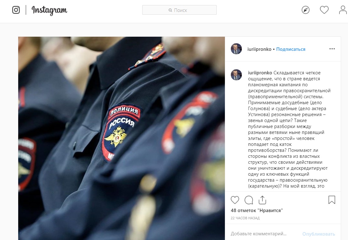 "Складывается четкое ощущение, что в стране ведется планомерная кампания по дискредитации правоохранительной (правоприменительной) системы. Принимаемые досудебные (дело Голунова) и судебные (дело актера Устинова) резонансные решения - звенья одной цепи?"- задает он вопрос.