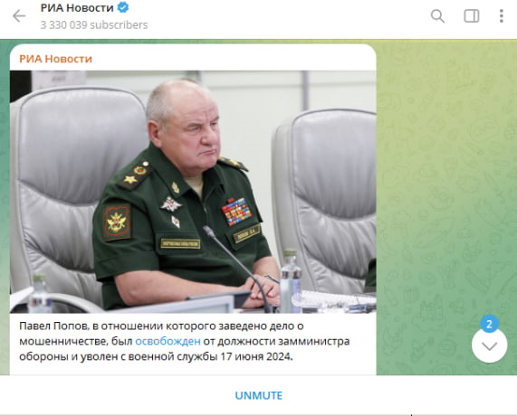 Агентство уточняет, что Попов, в отношении которого заведено дело о мошенничестве, был освобождён от должности замминистра обороны и уволен с военной службы 17 июня 2024-го.
