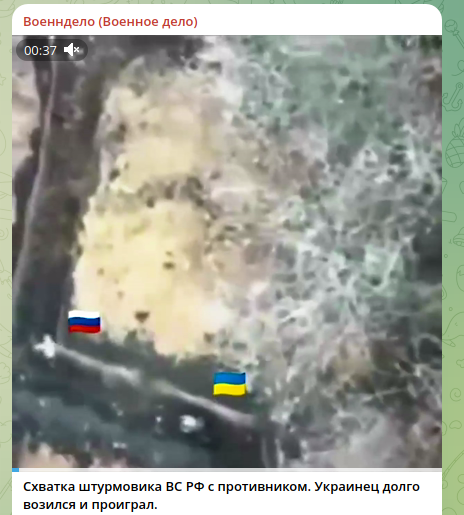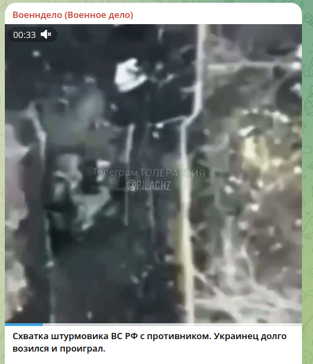 В телеграм-канале "Военное дело" показывается, как сначала за солдатом ВС России гонится вэсэушник. Затем они начинают драться. Победу в итоге одерживает русский.