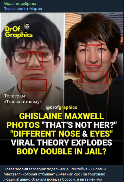 Ещё одна конспирологическая версия: соратница Эпштейна, британская светская львица Гислейн Максвелл, севшая на 20 лет за торговлю людьми для сексуальной эксплуатации, давно сбежала из тюрьмы, а вместо неё сидит дублёрша.