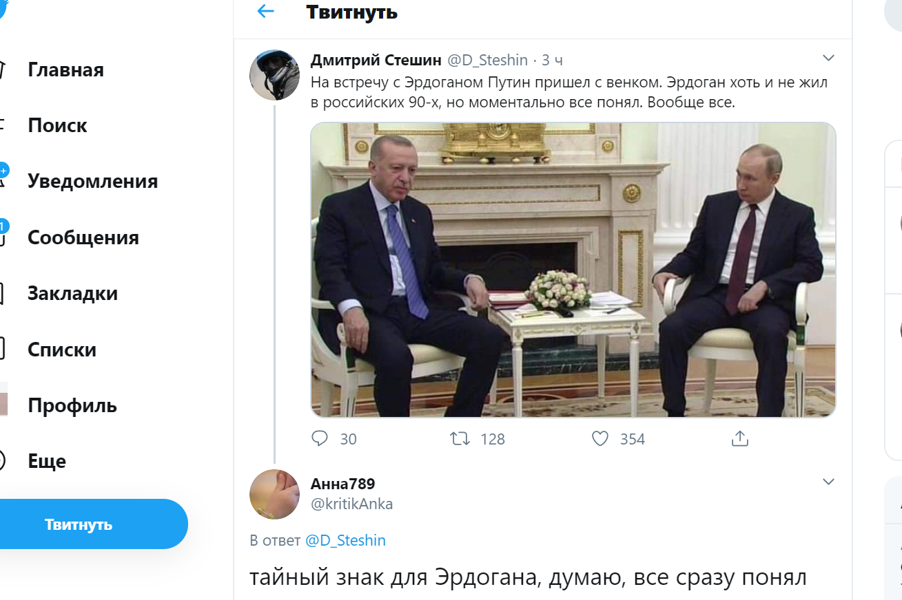 "На встречу с Эрдоганом Путин пришёл с венком. Эрдоган хоть и не жил в российских 90-х, но моментально всё понял. Вообще всё", - написал он на странице в Twitter.