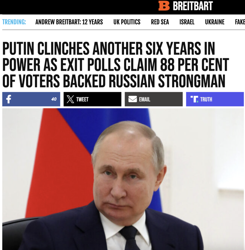 Путин проводит выборы во время крупнейшего вооружённого конфликта со времён Второй мировой войны и выигрывает 87% голосов при рекордно высокой явке. Запад осуждает это как тиранию. Зеленский отменяет выборы, сажает в тюрьму свою политическую оппозицию и отправляет своего главного соперника в Великобританию. Запад называет "страну У" образцовой демократией и посылает ей десятки миллиардов долларов,