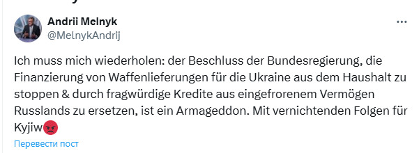 Решение федерального правительства прекратить финансирование поставок оружия Украине из бюджета и заменить его сомнительными кредитами из замороженных российских активов - это Армагеддон с разрушительными последствиями для Киева,