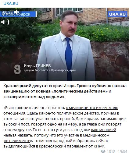 Красноярский депутат и врач Игорь Гринев рассказал о глобальном медицинском эксперименте, который осуществляется в настоящее время в России. Так эксперт охарактеризовал развернувшуюся в стране прививочную кампанию: "Это даже вакцинацией нельзя назвать".