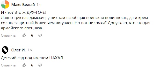 "Ладно трусы дамские, у них там всеобщая воинская повинность, да и крем солнцезащитный более чем актуален. Но вот пилочки? Допускаю, что это для армейского спецназа".