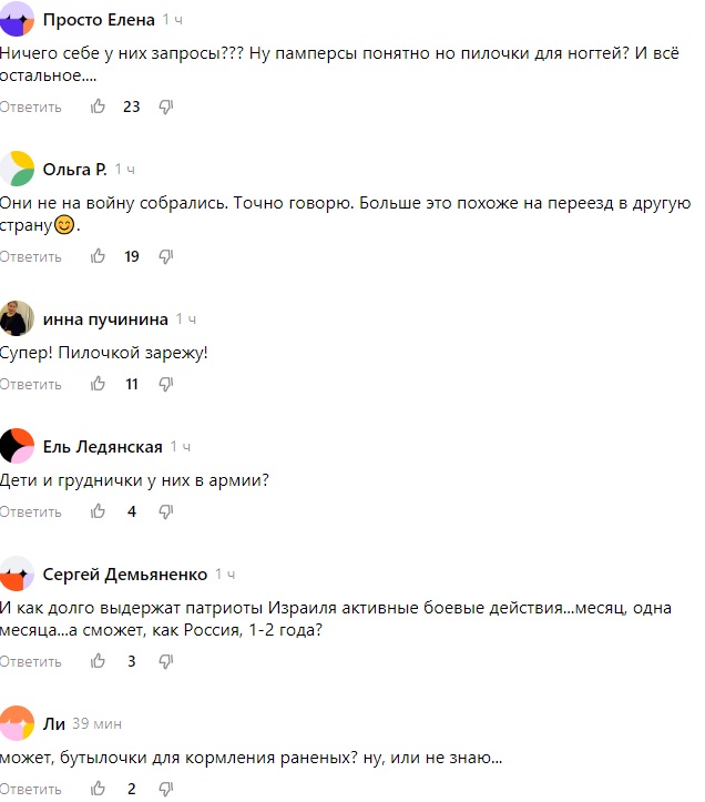 Ранее большое удивление вызвали сборы с народа для израильской армии. Называя себя "самой сильной на Ближнем Востоке", она просит у населения собрать множество вещей - от пилочек для ногтей до подгузников и настольных игр. Пункты сбора "предметов первой необходимости" для солдат ЦАХАЛ в Израиле открыли ещё неделю назад.
