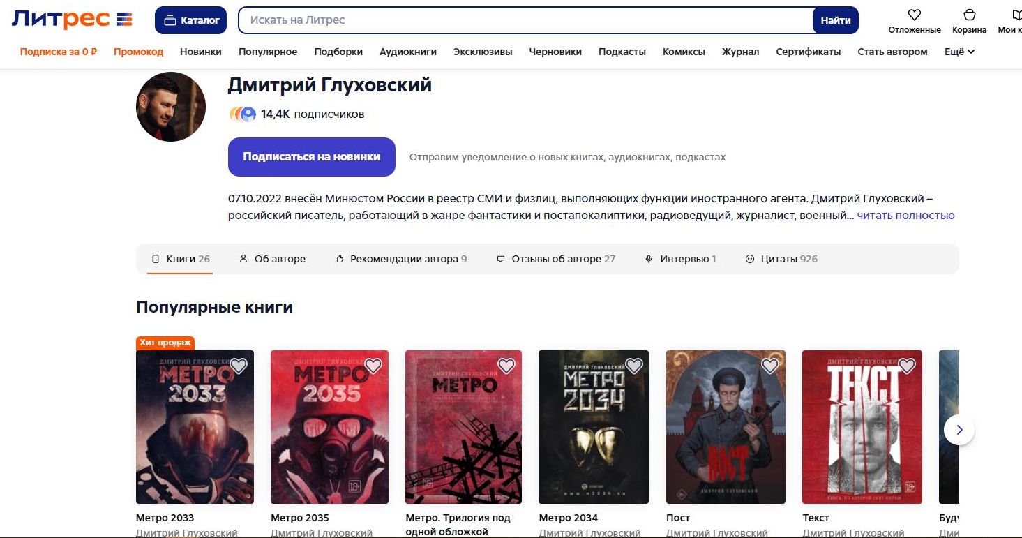 Ещё два месяца назад, в августе, Царьград обращал внимание на то, что произведения как Глуховского*, так и ряда других писателей-русофобов с букетом "наград" в виде статусов "иноагент" и "экстремист", свободно (иногда даже без соответствующих, обязательных по закону, "звёздочек" и обозначений) продаются на отечественных маркетплейсах.