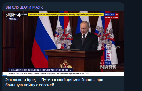 На расширенном заседании коллегии Минобороны России президент Владимир Путин дал жёсткую оценку риторике, захлестнувшей политические круги Европы. Говоря о наращивании наступательных сил НАТО и модернизации вооружений, он перешёл к главному: "В Европе людям вбивают в голову страхи по поводу неизбежного столкновения с Россией, мол, надо готовиться к большой войне". И далее последовала чёткая и недвусмысленная позиция: