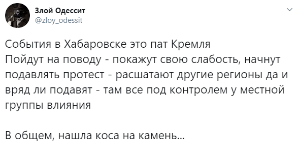 В своём микроблоге он написал, что, если российские власти в Хабаровске "пойдут на поводу" у активистов, то таким образом "покажут свою слабость". Если же они "начнут подавлять протест", то в этом случае "расшатают другие регионы, да и вряд ли подавят - там все под контролем у местной группы влияния".