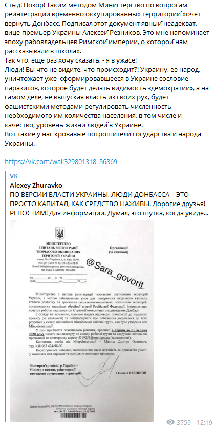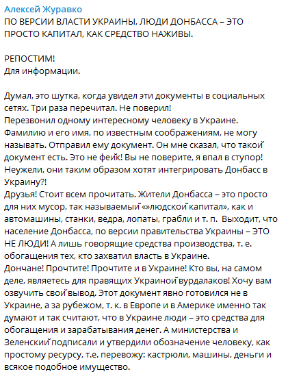 Жители Донбасса - это просто для них мусор, так называемый людской капитал, как автомашины, станки, вёдра, лопаты и грабли. Выходит, что население Донбасса, по версии правительства Украины, не люди, - пишет политик в Telegram.