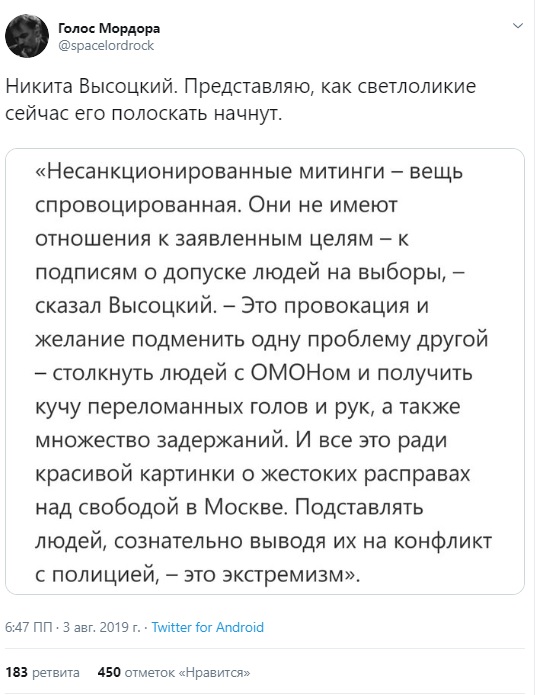 Своими акциями протеста такие организаторы пытаются подменить одну проблему другой. Фактически все это нужно, чтобы людей искусственно столкнуть с ОМОНом. Организаторы понимают, что такие столкновения будут в любом случае. К слову, автор блога "Голос Мордора" уже предположил, что Никите Высоцкому достанется от так называемых "светололиких" после сказанного.