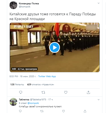 Одна из таких тренировок попала на видео: рота китайских солдат в белоснежных перчатках и защитных масках маршируют по улице и с грозным видом поют "Катюшу". Ролик опубликовал твиттер-канал "Командир полка". В комментариях зрители разделились во мнениях: кто-то порадовался дружбе русских и китайцев, а кого-то вид китайской армии, марширующей по Москве, явно тревожит.