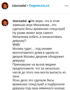 Садальский же сообщил, что не верит в то, что в деле замешан внук Михалкова и выдаёт свою версию случившегося.