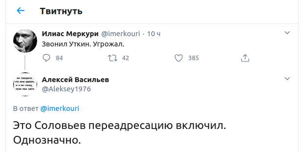 Журналист Илиас Меркури заявил о том, что ему с угрозами звонил комментатор Василий Уткин. Один из пользователей иронично предположил, что "это Соловьёв переадресацию включил".