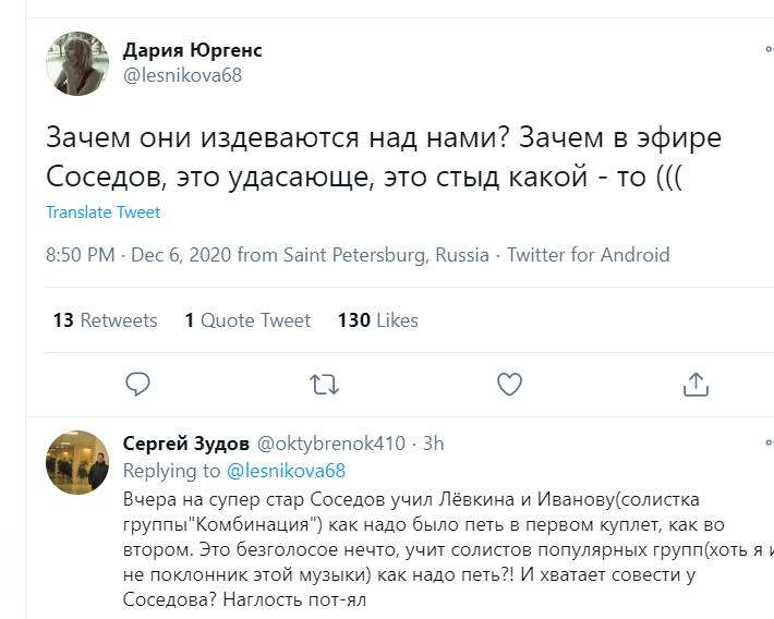 Так, актриса Дарья Лесникова-Юргенс, прославившаяся прежде всего участием в фильме Балабанова "Брат-2", не стала стесняться и рубанула с плеча: "Зачем они издеваются над нами? Это ужасающе, это стыд какой-то", - написала она в своём Twitter после просмотра третьего выпуска от 6 декабря.