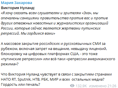 Захарова прокомментировала слова Нуланд, которая выразила сожаление в связи с закрытием радиостанции "Эхо Москвы". Американская чиновница заявила, что гордится эховцами и другими "жертвами путинских репрессий".