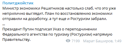 "План по восстановлению экономики отправили на доработку, а тут ещё и Ростуризм забрали", - написал Баширов в своём Telegram-канале, уточнив, что президент Владимир Путин подписал указ о переподчинении Федерального агентства по туризму (Ростуризм) напрямую правительству.