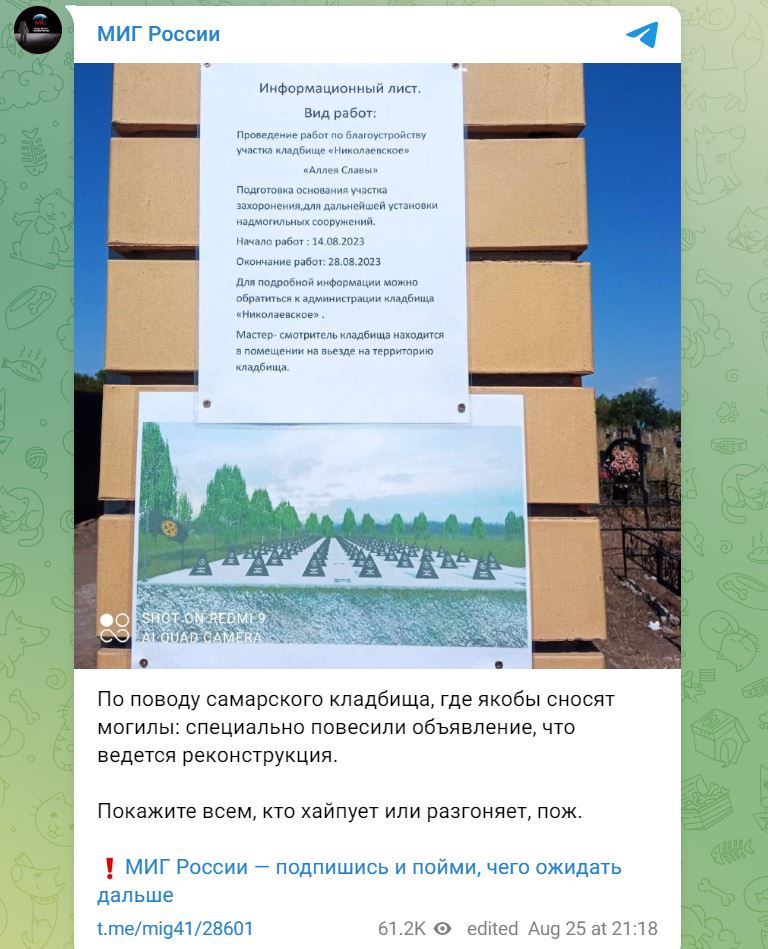 Отмечается, что площадку Аллеи памяти погибших вагнеровцев забетонируют, а над каждым захоронением появится чёрный мемориал в форме пирамиды. Кроме того, на кладбище специально повесили объявление, что ведётся реконструкция.