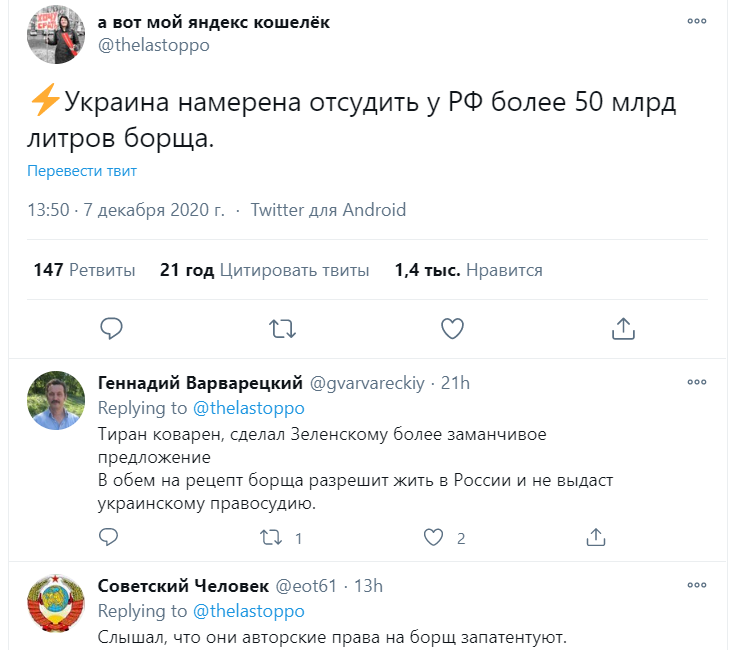 Развернувшаяся нынешней осенью "война борщей", когда украинские чиновники выразили беспокойство в связи с тем, что русские присвоили себе "исконно украинское блюдо", получила неожиданное продолжение. Новость озвучил твиттер-аккаунт "А вот мой яндекс-кошелёк". Твит гласит: