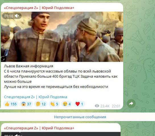 Военный эксперт, блогер Юрий Подоляка в телеграм-канале "Спецоперация Z" опубликовал "важную информацию" для жителей Львова. Подоляка написал, что на 6 мая по всей области запланированы массовые облавы. Для этого, по данным блогера, в регион приехало 400 бригад ТЦК. На время нахождения бригад в области от перемещений лучше воздержаться.