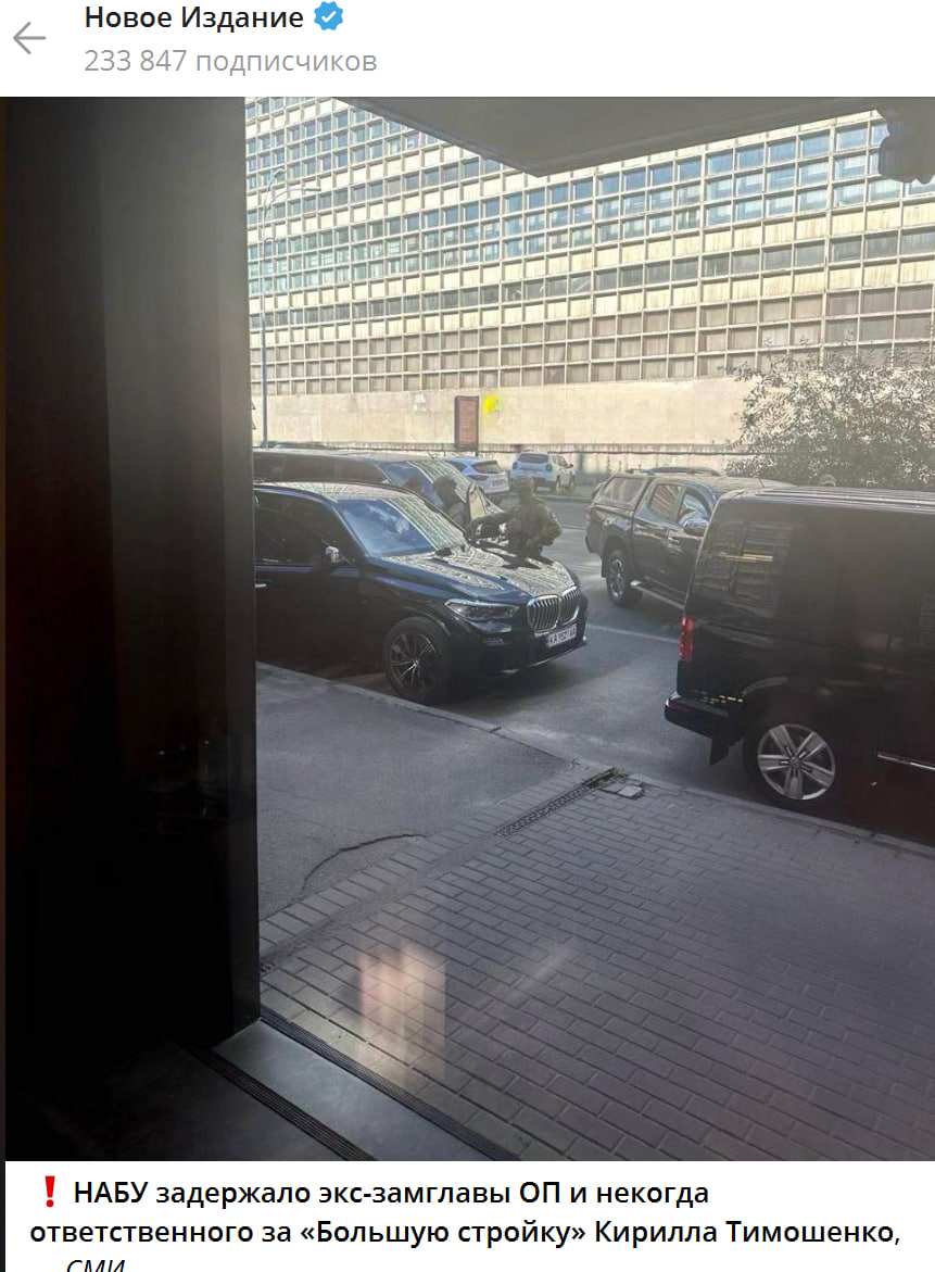 Причиной обысков у приближенного Зеленского якобы стала утечка информации из НАБУ. Издание "Телеграф" обнародовало фото, на котором запечатлены вооруженные люди в масках, открывающие двери автомобиля, предположительно принадлежащего экс-чиновнику.