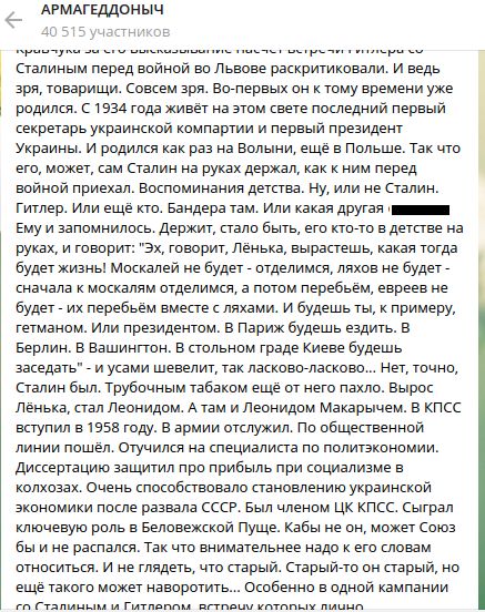 "И ведь зря, товарищи. Совсем зря. Во-первых, он к тому времени уже родился. С 1934 года живёт на этом свете последний первый секретарь украинской компартии и первый президент Украины. И родился как раз на Волыни, ещё в Польше", - напомнил Сатановский и продолжил, явно не без изрядной доли сарказма: - Так что его, может, сам Сталин на руках держал, как к ним перед войной приехал. Воспоминания детства. Ну, или не Сталин. Гитлер. Или ещё кто. Бандера там".