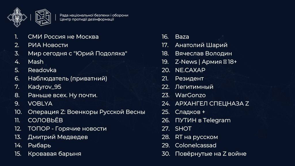 Первые строчки списка "агентов Кремля" занимают Telegram-каналы популярных русских СМИ. При этом на седьмом месте находится канал главы Чечни Рамзана Кадырова, а замыкают десятку лидеров военкоры "Русской весны".
