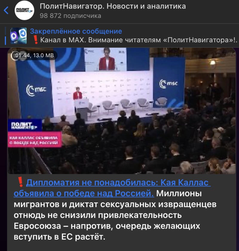 Кая Каллас победила Россию. Снова. Так еврокомиссар по иностранным делам Кая Каллас на Мюнхенской конференции по безопасности объявила о триумфе ЕС над Россией. По её словам, несмотря на миллионы мигрантов и критику "диктатом сексуальных меньшинств", привлекательность Евросоюза только растёт - очередь стран на вступление удлиняется.