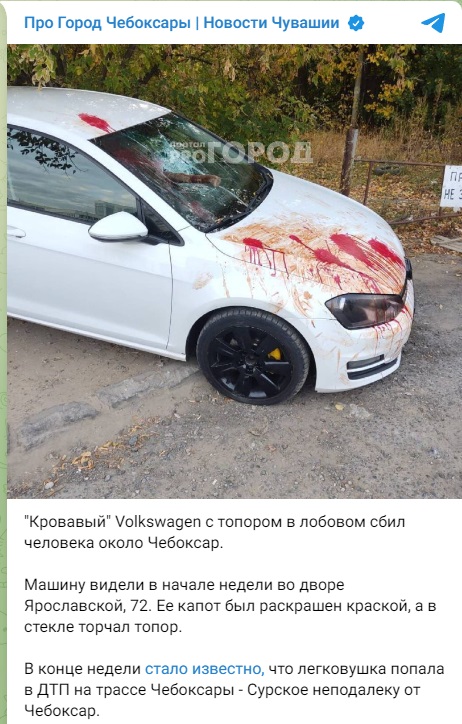 Необычное ДТП случилось в Чувашии. Там автомобиль, раскрашенный бутафорской кровью и с торчащим из лобового стекла топором сбил пешехода.