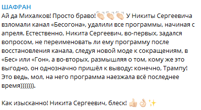 "Как изысканно, Никита Сергеевич. Блеск!": Шафран оценила ответ Михалкова хакерам