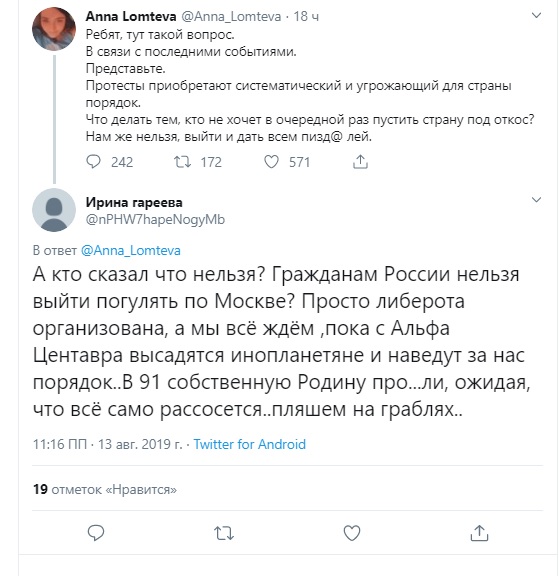 "Ребят, тут такой вопрос. В связи с последними событиями. - пишет Ломтева. - Представьте, протесты приобретают систематический и угрожающий для страны поврядок. Что делать тем, кто не хочет в очередной раз пустить страну под откос? Нам же нельзя выйти и дать всем ..."