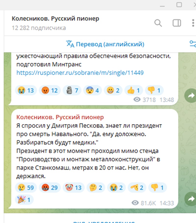 "Я спросил у Дмитрия Пескова, знает ли президент про смерть Навального. "Да, ему доложено. Разбираться будут медики". Президент в этот момент проходил мимо стенда "Производство и монтаж металлоконструкций" в парке Станкомаш, метрах в 20 от нас. Нет, он держался".