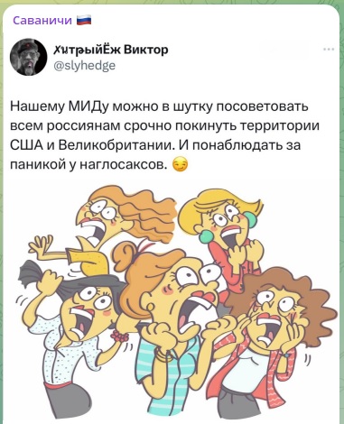 В ответ на постоянные провокации Запада русскому МИД предложили в шутку посоветовать всем гражданам России срочно покинуть территории США и Великобритании. А затем наблюдать за паникой Запада.