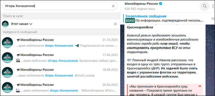 В официальных пресс-релизах ведомства генерал Конашенков тоже появлялся достаточно давно. Скриншот: официальный ТГ-канал Минобороны