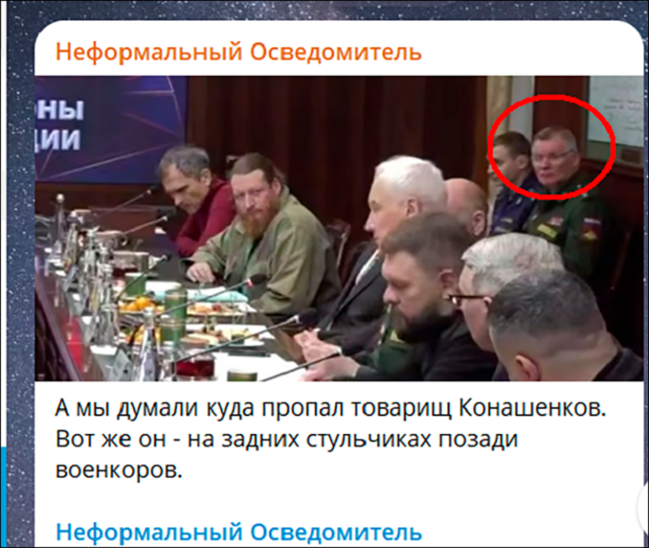 Авторы тг-канала "Два майора" обратили внимание, что на видео запечатлено, "как у стенки справа внимательно наблюдает за встречей генерал-лейтенант Конашенков, глава Департамента информации и массовых коммуникаций МО".