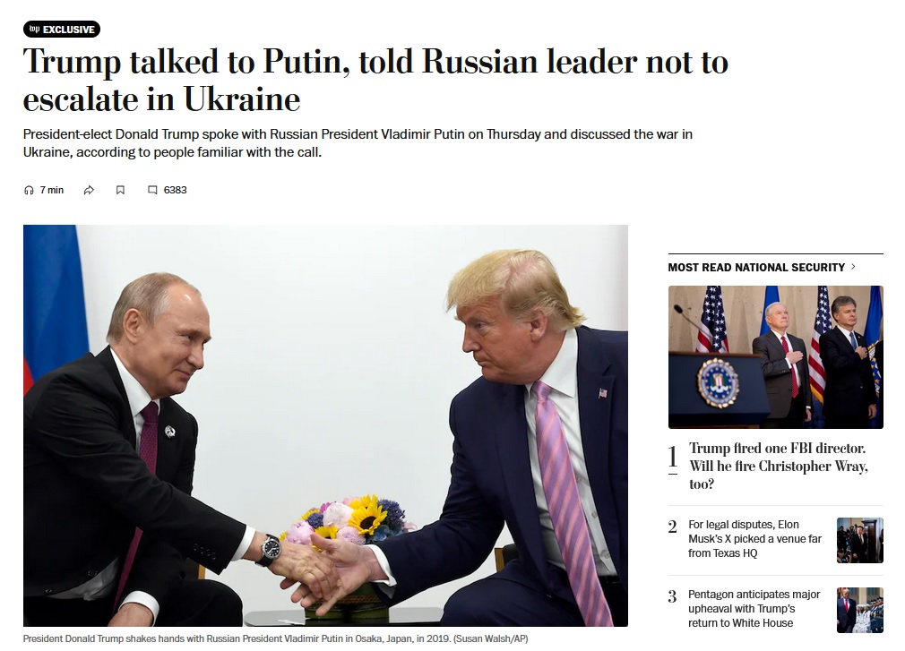 Дональд Трамп первым позвонил Владимиру Путину, чтобы наладить диалог, утверждает The Washington Post. Газета опубликовала подробности разговора.