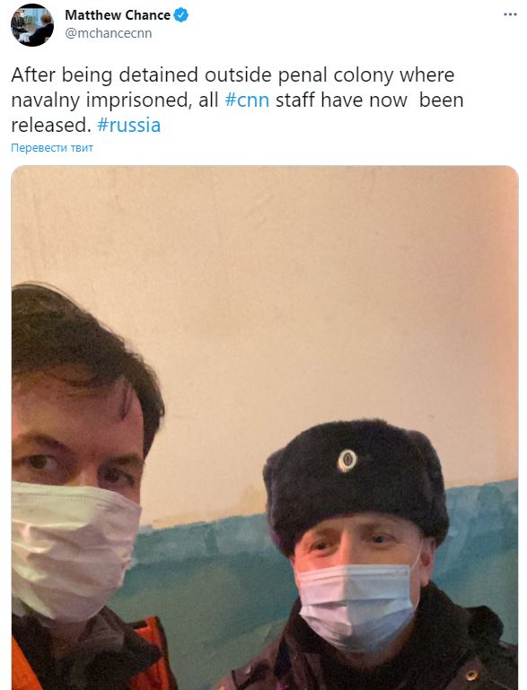 После задержания за пределами колонии, где находился Навальный, все сотрудники CNN были освобождены, - пишет он, выкладывая заодно селфи с одним из сотрудников полиции.