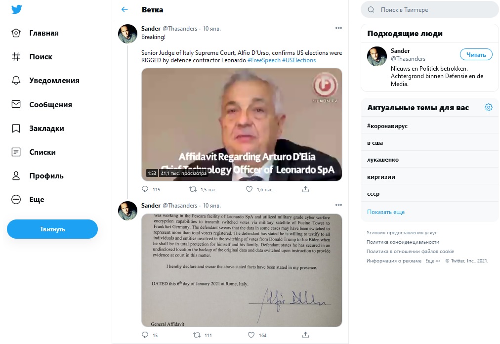 По словам адвоката, ещё 5 января итальянская полиция задержала ИТ-эксперта Артуро Д'Элиа, работавшего непосредственно на компанию Leonardo SpA. Программист признался, что был одним из тех, кто напрямую "нажимал на кнопку", чтобы обеспечить Байдену необходимый приток голосов,