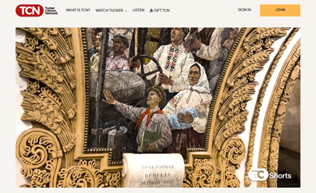 Ролик Такера Карлсона был снят на станции метро "Киевская". На её стенах - восхитительные мозаики в стилистике соцреализма с украинскими учёными, спортсменами, крестьянами и военными. Нет никаких карикатурных казачков в шароварах с бандурами. Все образы строгие, серьёзные, без тени иронии и тем более без насмешки.